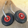 Транцевые колеса, установленные на моторно-гребную лодку ПВХ с жестким транцем, существенно, упрощают транспортировку судна от воды до места стоянки. Закрепляются на транцевой плите при помощи винтов и гаек. Имеют фиксаторы в рабочем и сложенном положении. Надувные колеса позволяют приспособиться к различному типу грунта, изменяя давление в шине.